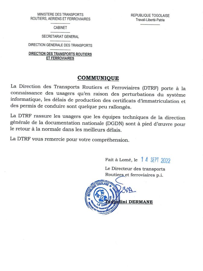 La délivrance des plaques d’immatriculation et des permis de conduire connait des perturbations depuis quelques temps au Togo. Dans un communiqué rendu public en fin de semaine dernière, la Direction des transports routiers et ferroviaires (DTRF), lie cette situation à un certain nombre de facteurs.