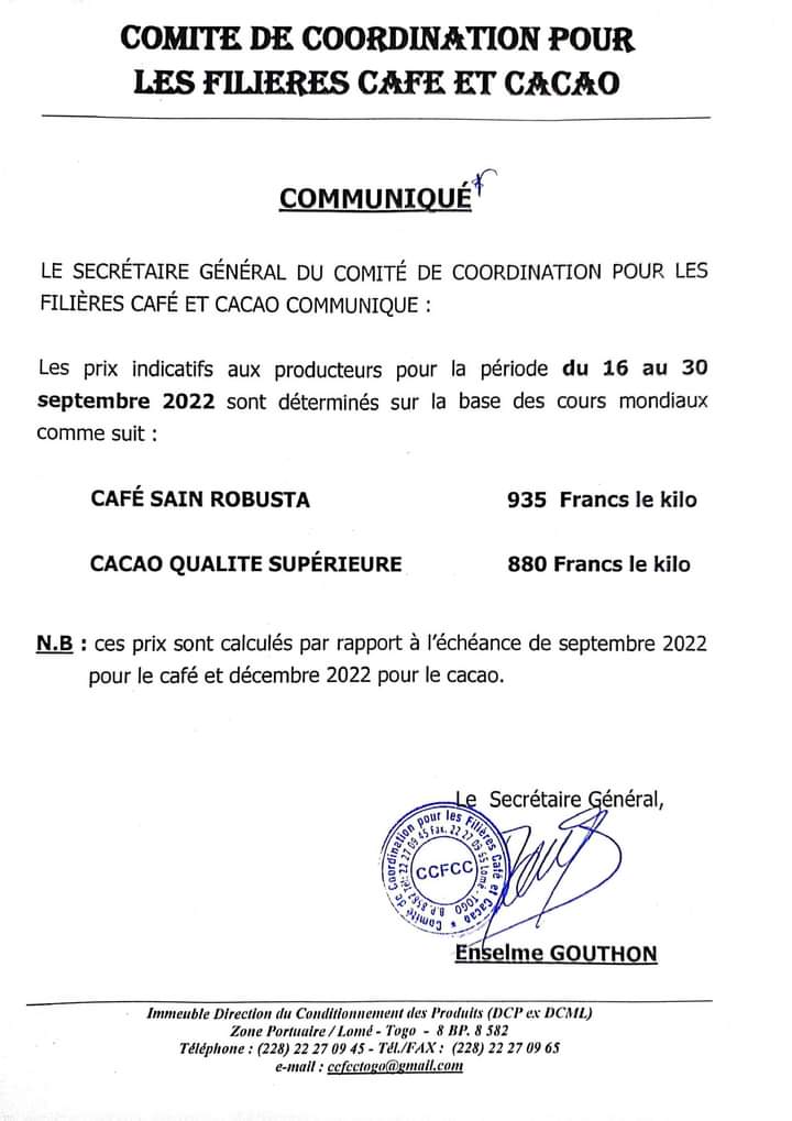 Alors que la campagne du mois du consommer local pointe à l’horizon, le Comité de coordination pour les filières café et cacao vient de rendre public les prix incitatifs aux producteurs togolais de ces deux filières.