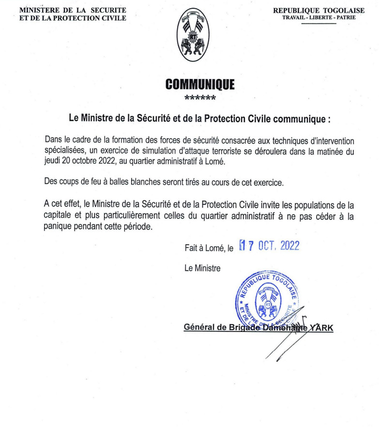 La matinée de demain jeudi 20 octobre sera très animée au quartier administratif de Lomé. Selon le ministre de la Sécurité, les forces de défense et de sécurité feront une simulation d’une attaque terroriste, ceci afin de se familiariser aux techniques d’interventions spécialisées.