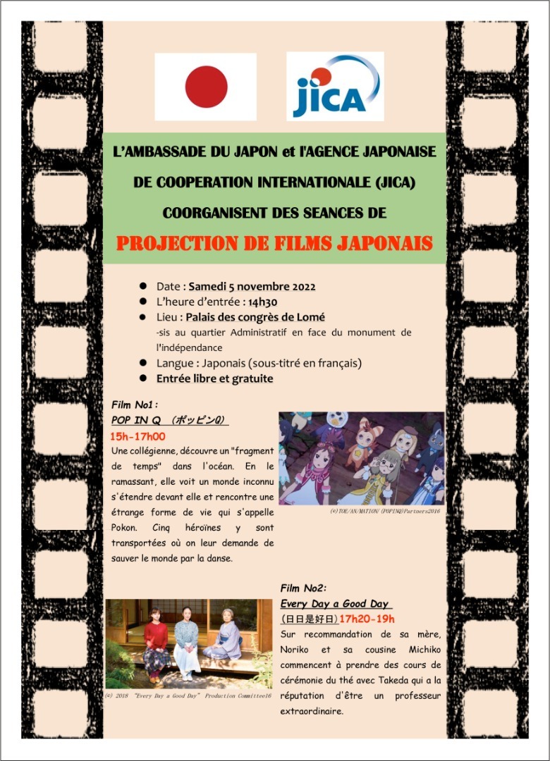 Les amoureux des films asiatiques, notamment nippons, auront de quoi se rincer les yeux début novembre prochain. L’ambassade du Japon et l’Agence japonaise de coopération internationale(JICA) organisent une séance de projection de films japonais, le samedi 05 novembre prochain, au Palais des Congrès de Lomé. Rassurez-vous, l’entrée est libre et gratuite.