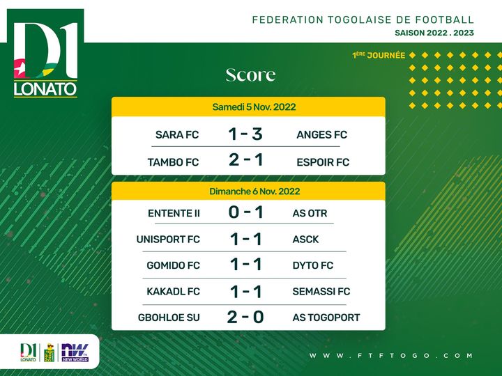 Les rideaux sont tombés sur la première journée de la D1 Lonato, ce dimanche 6 novembre, avec des fortunes diverses pour les équipes engagées dans les sept rencontres. À noter une première réussie pour le promu Tambo. Dyto arrache un match nul devant Gomido de Kpalimé…