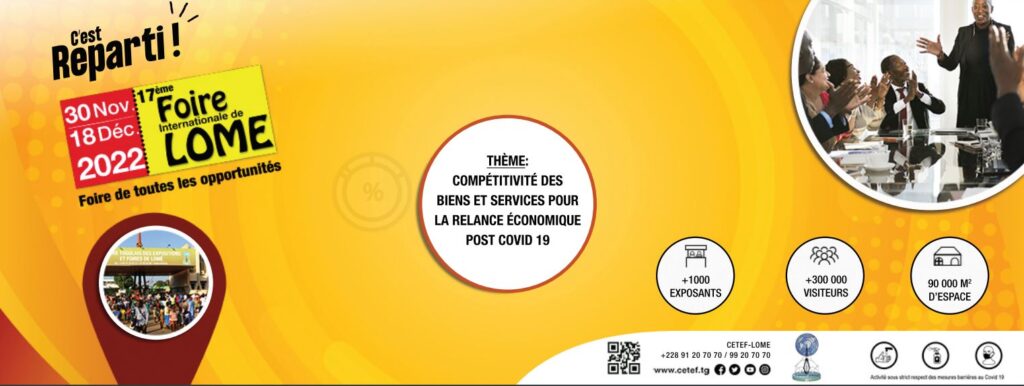 « Compétitivité des biens et services pour la relance économique post covid-19 », tel est le thème de la 17è Foire internationale de Lomé (FIL) qui se tiendra du 30 novembre au 18 décembre 2022 au Centre togolais des expositions et foires (CETEF) de Lomé. Un événement grandeur nature qui reprend vie après deux années de suspension du fait de la pandémie au coronavirus.