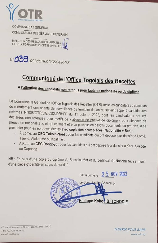 COMMUNIQUÉ N°039/2022/OTR/CG/CSG/DRHFP – A L’ATTENTION DES CANDIDATS NON RETENUS POUR FAUTE DE NATIONALITÉ OU DE DIPLÔME