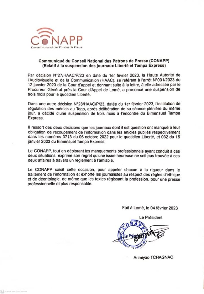 Cette situation ne laisse indifférentes les organisations de presse. Tout en déplorant le « manque de professionnalisme »ayant conduit à cette situation, le Conseil National des Patrons de Presse (CONAPP) exprime ses regrets face à une situation qu’il aurait souhaité voir se régler différemment.