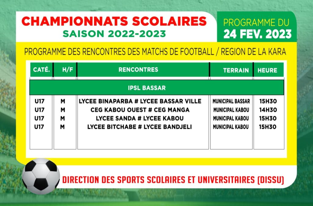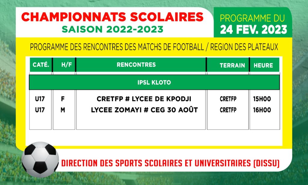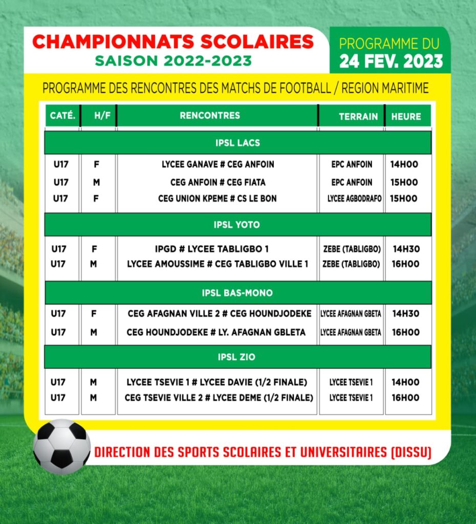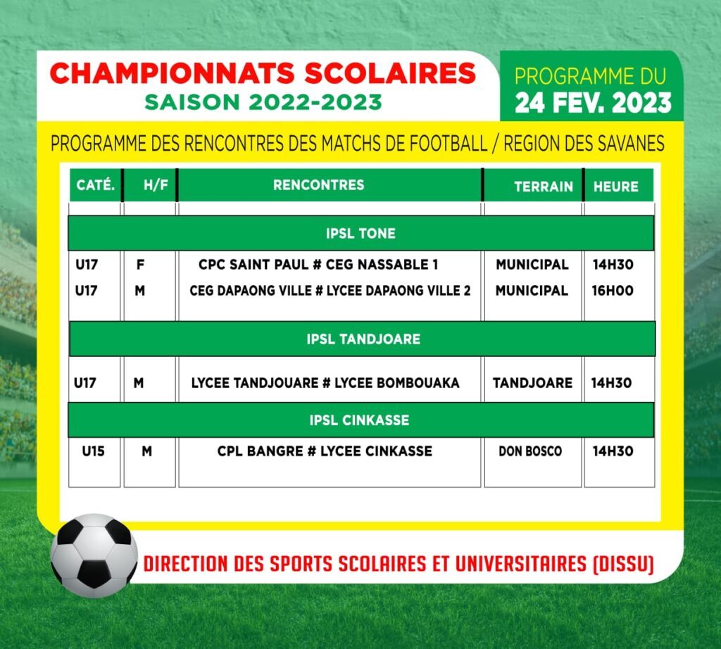 Démarré effectivement le mercredi 08 février dernier, les championnats scolaires et universitaires, édition 2022-2023, avec du football U15 et U17 hommes et dames, se poursuit ce vendredi 24 février avec différentes rencontres sur l’ensemble du territoire national.