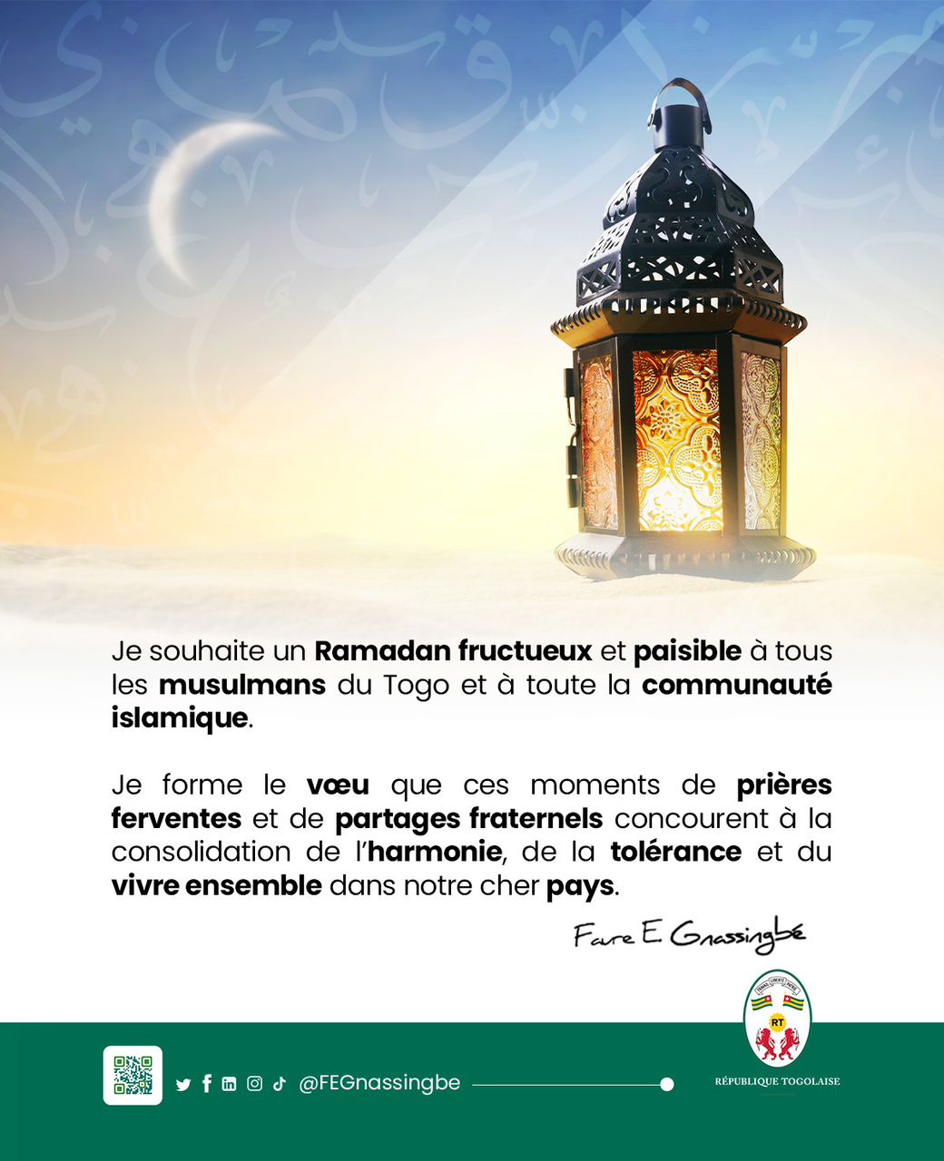 « Je souhaite un Ramadan fructueux et paisible à tous les musulmans du Togo et à toute la communauté islamique.