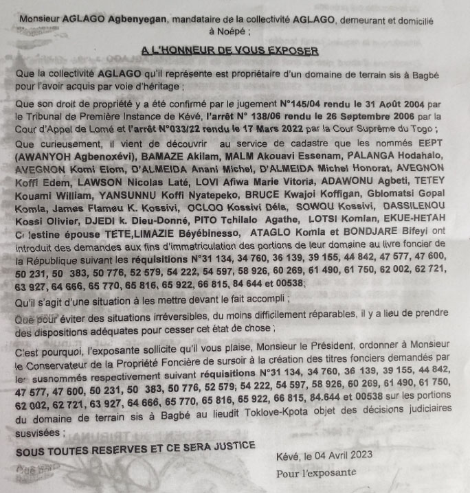 D’ailleurs une requête du tribunal de première instance à compétence civile de Kévé relève que tous ceux qui ont acquiert des propriétés à Bagbé auprès du sieur Elias Sokpor, l’ont fait à leur dépend et qu’ils ne pourront pas jouir de leur droit de propriété. D’ailleurs leurs demandes aux fins d’immatriculations des portions de leur domaine au livre foncier de la République, ont été simplement suspendues par décision de justice ceci pour « éviter des situations irréversibles, du moins difficilement réparables ».
