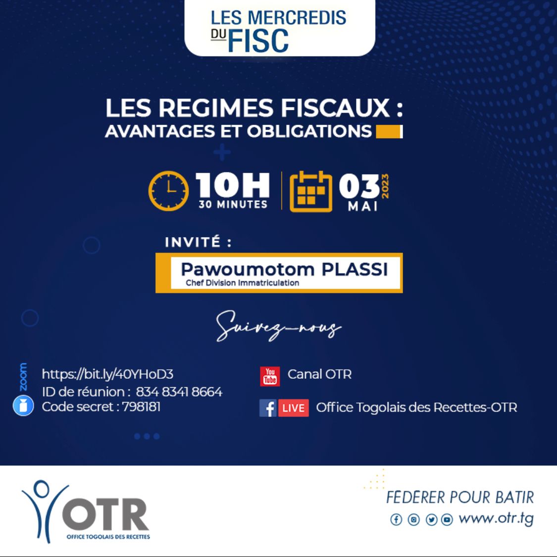 Rendez-vous sur les différents canaux de diffusion de l’office togolais des recettes (OTR), notamment YouTube, FaceBook Live, et Zoom, pour avoir toutes les informations sur les régimes fiscaux, leurs avantages mais aussi les obligations afférentes.