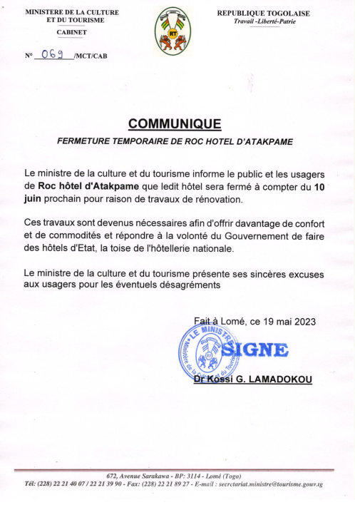 C’est ce qu’indique un communiqué signé du ministre de la Culture et du Tourisme, Dr Kossi Gbenyo Lamadokou, en date du 19 mai 2023.