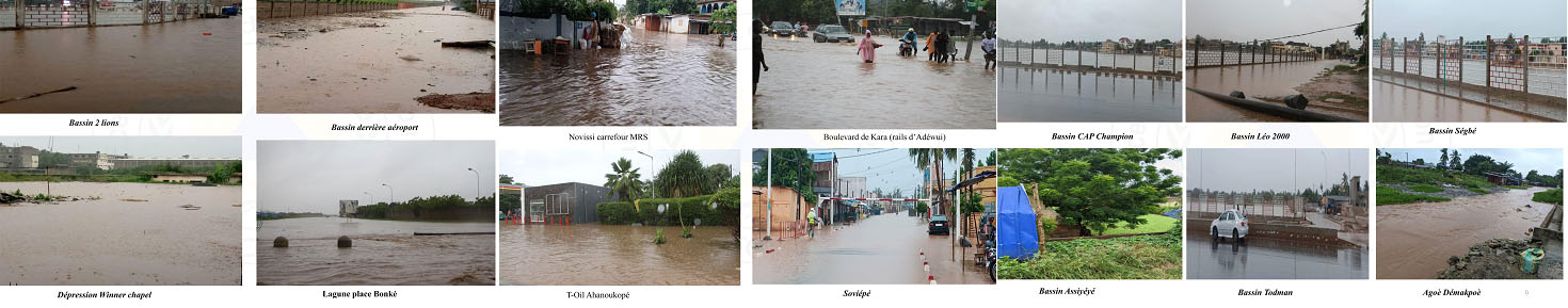 La situation est critique dans les localités suivant : Novissi (pharmacie Gbézé et ses environs), Boulevard de Kara (rails d’Adéwui), Boulevard des armées (Carrefour Adjale) , Ahanoukopé et Place Bonké (Lagune débordée), Hédzranawoe (derrière Hôtel El Doria), Tokoin Gbadago, Atikoumé, Légbassito (Daliko et Kpaogli), Agoè (Sépérépé, carrefour Kpogli, Kossigan); mais aussi à Zongo et Bè.