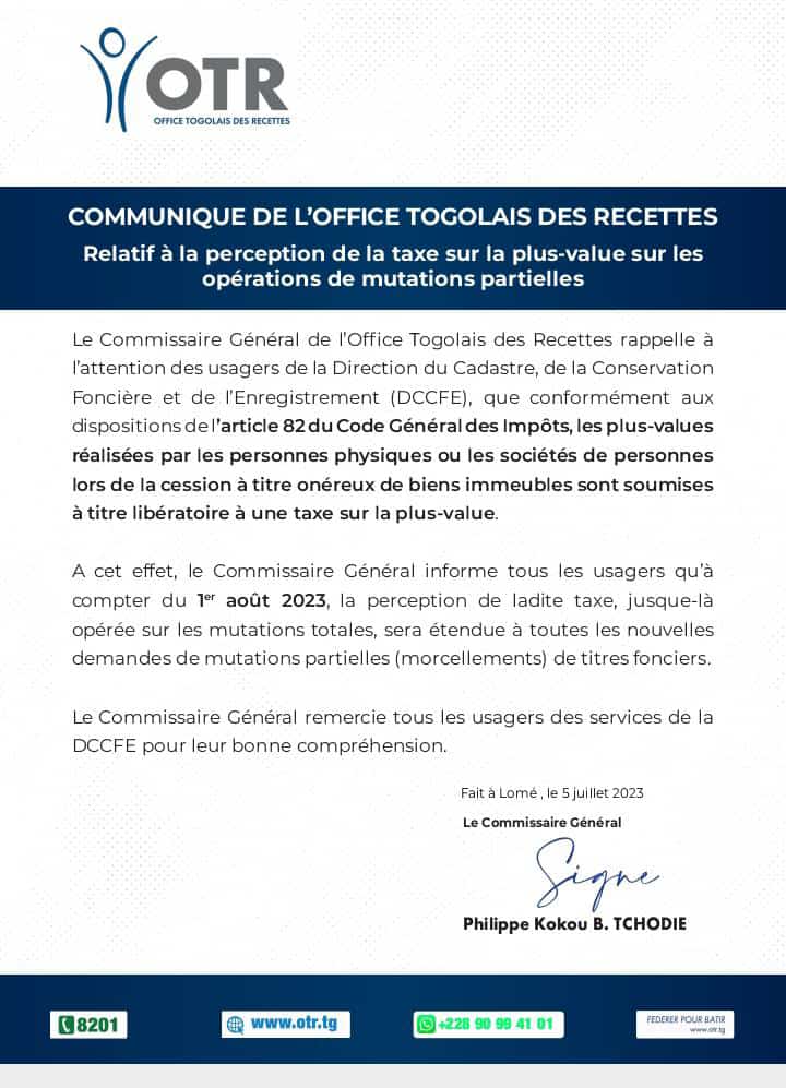 AVIS DE DEMANDE DE RENSEIGNEMENT DE PRIX RESTREINTE (ADRPR) – OFFICE TOGOLAIS DES RECETTES (OTR)