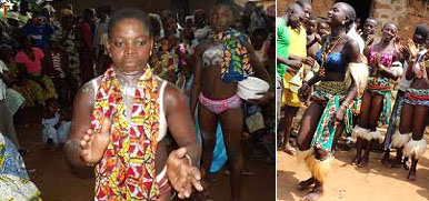 Ainsi, Akpénou (l’aspirante), très dévêtue, la hanche seulement ceinte de perles, « kédjissi» la tête rasée, un collier en fer au cou, part avec ses autres camarades en file indienne dans la forêt sacrée où se poursuivent les cérémonies. Tout au long de l’initiation, elles sont accompagnées et prises en charge par des femmes adultes expérimentées.
