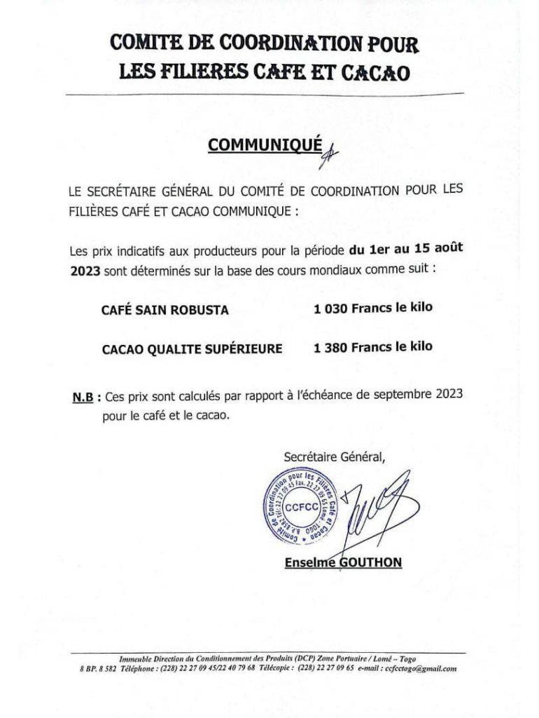 Les prix indicatifs pour la filière café & cacao pour le compte de la première quinzaine du mois ‘août, sont disponibles.