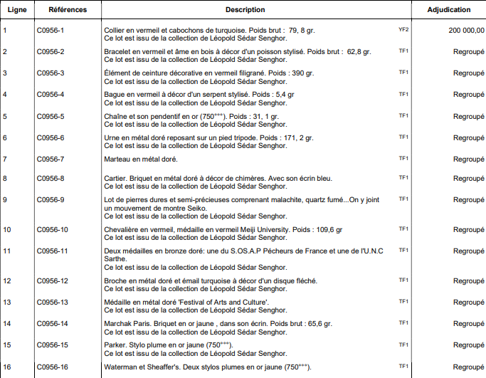 Le communiqué indique que « les objets appartenant au président Senghor et à son épouse s’élèvent à quarante et un (41) ». Il précise également que « les deux cent deux objets restants de l’offre concernent d’autres propriétés » et que « l’acquisition des biens exclut les autres offres ». Le coût de l’acquisition s’élève à 200 000 euros, soit 131 200 000 FCFA hors frais des cabinets des commissaires-priseurs, qui s’élèvent à 22% du coût des acquisitions en provinces et à 33% à Paris.