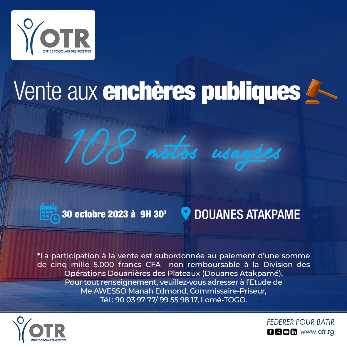 L’Otr informe les populations togolaises, surtout celles du septentrion, qu’il sera procédé à une opération de vente aux enchères publiques de 108 motos usagers.