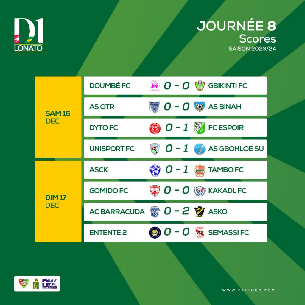 Dans les autres rencontres, l’As Otr et As Binah, font jeu égal, 0-0. Dyto perd de nouveau, 0-1, devant Espoir FC. Doumbé et Gbikinti se séparent dos-à-dos, 0-0. C’est le même score qui a sanctionné la rencontre Entente II contre Sémassi de Sokodé. Unisport perd 0-1 chez lui devant Gbohloe-Su des Lacs.