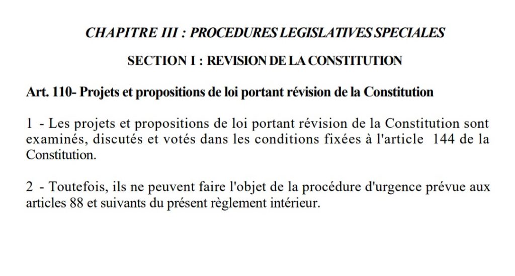 Si le règlement intérieur de l’Assemblée Nationale n’évoque pas la proposition de loi de modification de la Constitution, il faut noter qu’elle souligne que c’est la procédure ordinaire qui doit être suivie dans ce cas. Donc la procédure ordinaire voudrait dire le respect des procédures de révision de la Constitution sous forme de proposition de loi conformément aux articles 82 et 110 du Règlement Intérieur de l’Assemblée Nationale.