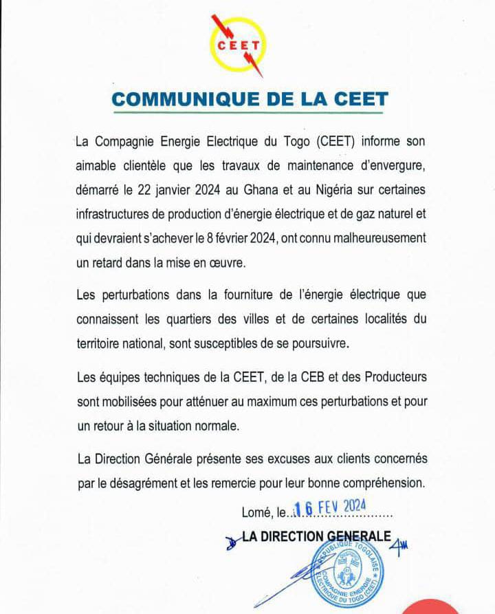 Dans un communiqué rendu public ce vendredi 16 février 2024, la Ceet informe l’opinion que « les travaux de maintenance d’envergure, démarrés le 22 janvier 2024 au Ghana et au Nigeria, sur certaines infrastructures de production d’énergie électrique et de gaz naturel », ne sont pas arrivés à leur terme. Ces travaux qui devraient « s’achever le 08 février 2024, ont connu malheureusement un retard dans la mise en œuvre ».