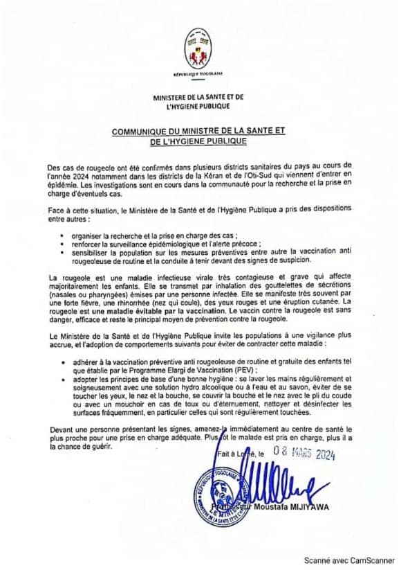 Le ministre de la Santé, prof Moustafa Mijiyawa, a annoncé, le vendredi 08 mars dernier, la découverte des cas confirmés de rougeole dans plusieurs districts sanitaires du pays.