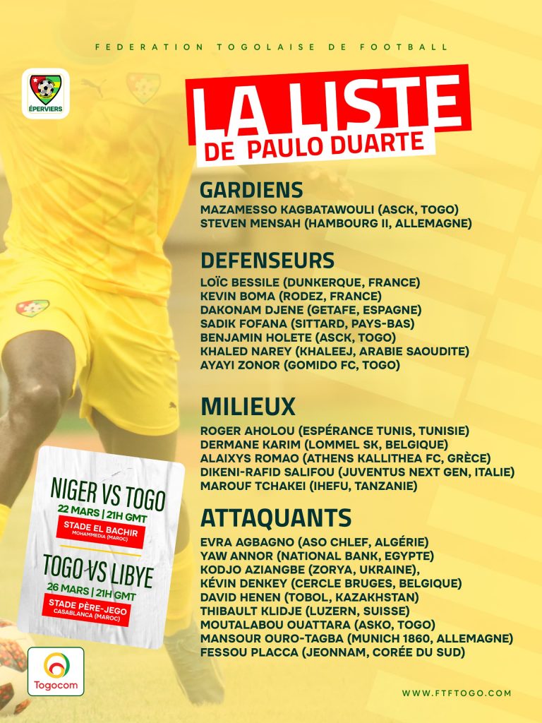 Le sélectionneur des Éperviers du Togo, Paulo Duarte a dévoilé, ce jeudi matin au siège de la Fédération Togolaise de Football (Ftf) la liste des joueurs retenus pour les journées Fifa de ce mois de Mars. Beaucoup de nouvelles têtes font leur entrée dans le nid des Éperviers du Togo.
