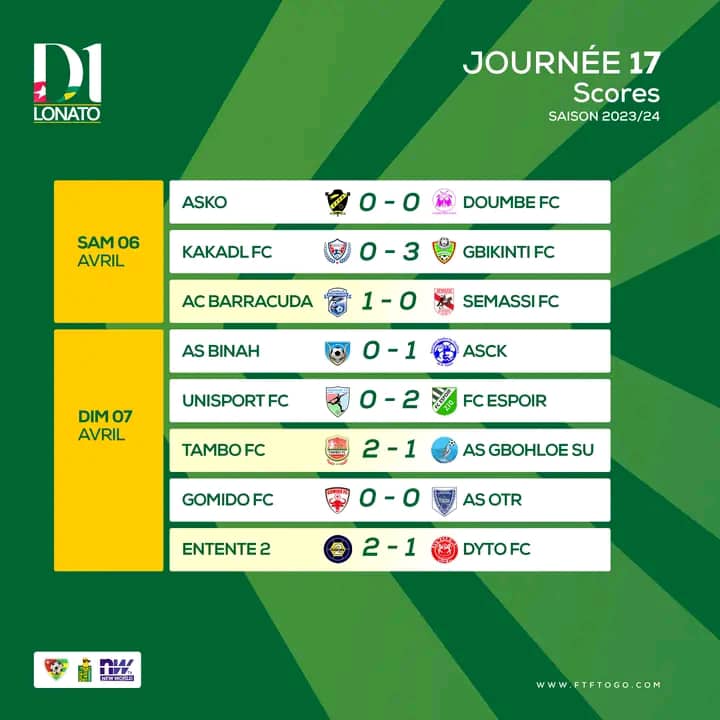 Épilogue, hier dimanche, de l’acte 17 du championnat national de football de première division, D1 Lonato. Démarrée samedi, le gros des matchs s’est joué hier dimanche 07 avril.