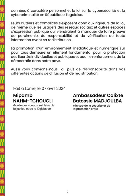 Selon le Garde des Sceaux, ministre de la justice et de la législation, Mipamb Nahm-Tchougli, et son collègue en charge de la Sécurité et de la protection civile, l’Ambassadeur Calixte Madjoulba, « les relais d’informations via les médias traditionnels ou par le truchement des réseaux sociaux reste soumis au respect de la déontologie et de l’éthique en matière d’information et de communication, et généralement à un devoir de responsabilité et de vérification des contenus partagés ».
