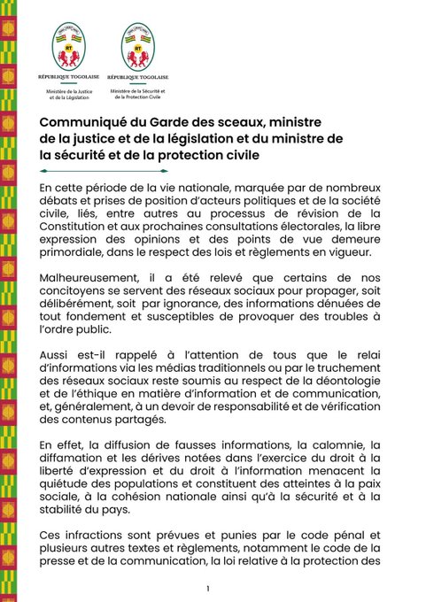 Tout en rappelant les dispositions réglementaires régissant, notamment « la diffusion de fausses informations, la calomnie, la diffamation », ou encore d’autres dérives liées à l’exercice du droit à la liberté d’expression et du droit à l’information au Togo, l’exécutif indique que ces dérives sont punies par le Code pénal et divers textes et règlement tels le Code de la presse et de la communication, la loi relative à la protection des données à caractères personnels, entre autres.