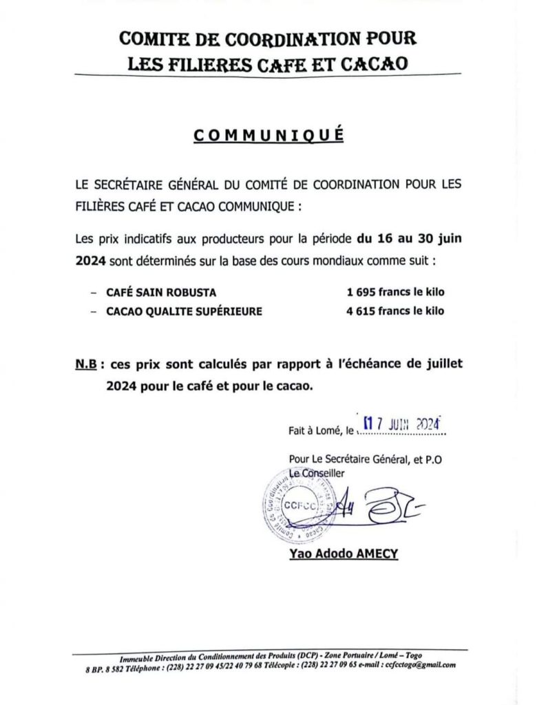 Le Comité de coordination pour les filières café et cacao a rendu public les nouveaux prix indicatifs pour la seconde quinzaine de ce mois de juin.