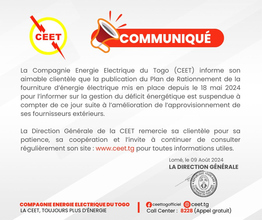 La fourniture du courant électrique va connaitre une régularisation dans les prochaines semaines, après plusieurs mois de perturbations. La Compagnie énergie électrique du Togo (Ceet) a annoncé, samedi 10 août dernier, la suspension de son plan de rationnement.