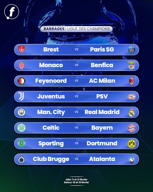 Rendez-vous donc les 11 & 12 février prochain, pour la manche aller, et la manche retour, une semaine plus tard, soit les 18 & 19 février 2025.