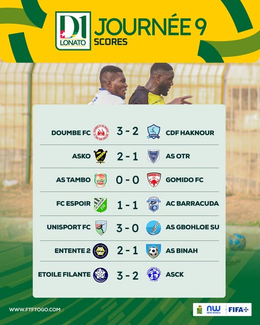 Le week-end dernier a rimé avec la 9e journée du championnat national de la D1-LONATO. Le leader a chuté lourdement devant Unisport de Sokodé. Étoile Filante renverse Asck dans un match fou, à noter également le coup d’arrêt pour l’AS OTR devant Asko de Kara.