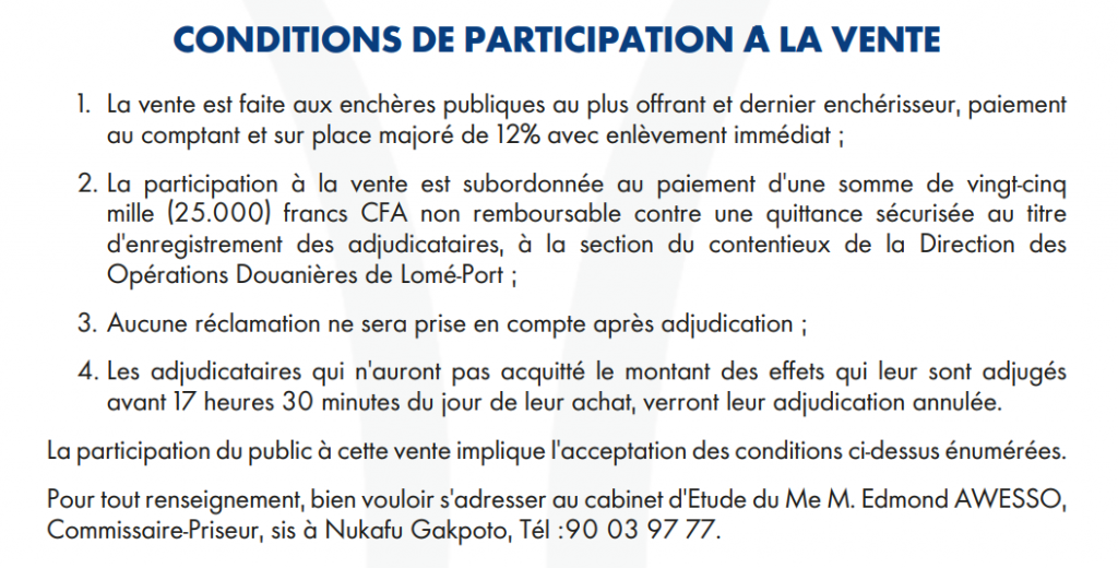 Comme dans pareilles circonstances, la participation à cette opération de vente aux enchères publiques est soumise au paiement d’une quittance non remboursable de 25.000 francs CFA.
