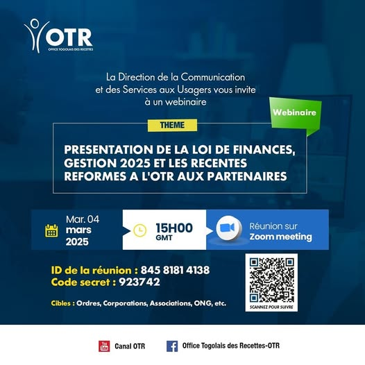 « Présentation de la loi de finances, gestion 2025 et les récentes réformes à L’OTR aux partenaires », tel est le thème du webinaire qu’organise, ce mardi 04 mars 2025 à partir de 15h00 (GMT), l’Office Togolais des Recettes (OTR), que la Direction de la Communication et des Services aux Usagers aura le plaisir de décortiquer.