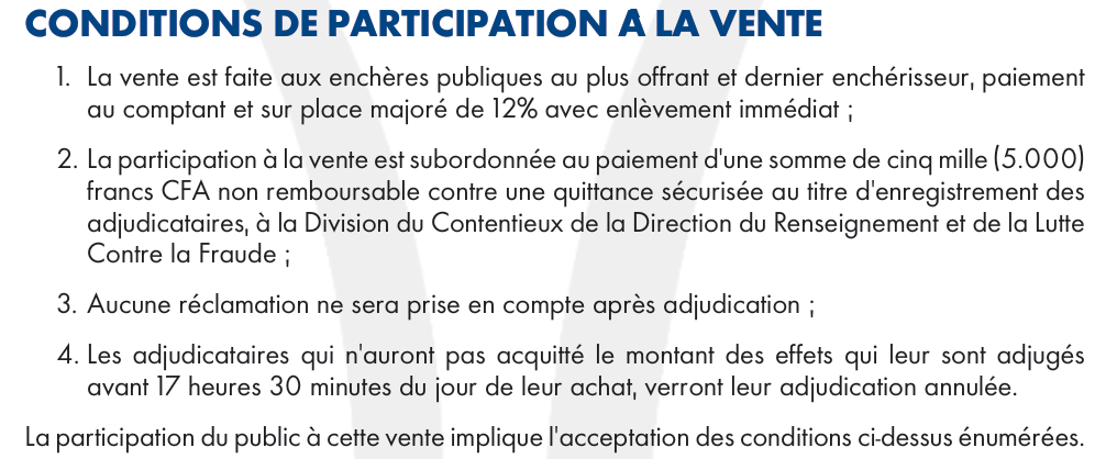 Comme à l’accoutumée, la participation est soumise au paiement d’une quittance non remboursable de 5.000 FCFA. Aussi, « la vente se fera au plus offrant et dernier enchérisseur, avec un paiement immédiat sur place, assorti d’une majoration de 12 %. L’enlèvement des biens acquis devra être effectué sans délai », précise l’Office.