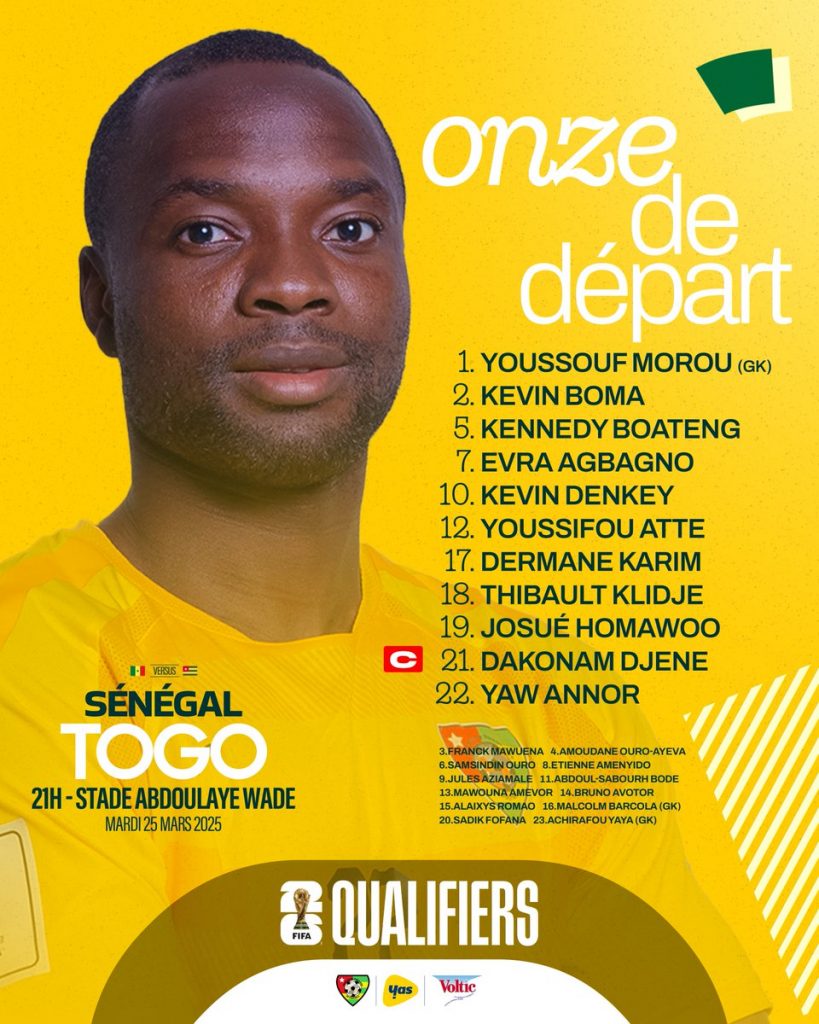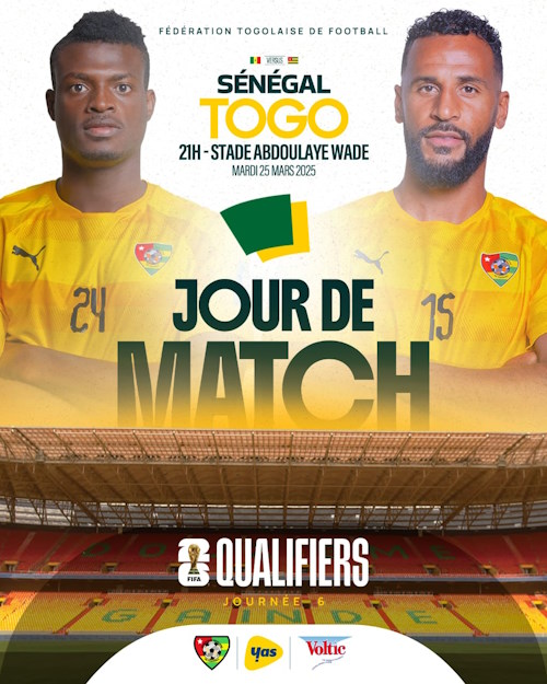 Le onze national de football du Togo défie son homologue du Sénégal cette nuit, sous le coup de 21 GMT, au Stade Abdoulaye Wade de Diamnidio, à Dakar. Cette rencontre s’inscrit dans le cadre de la 6ème journée des éliminatoires pour la coupe du monde 2026.