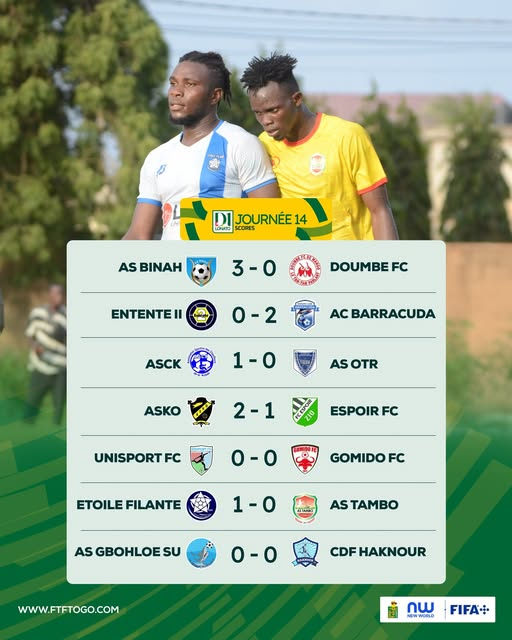 En avancé, samedi, l’AS Binah a étrillé, 3-0, la lanterne rouge, Doumbé de Mango. Match nul sans buts entre Unisport et Gomido. Score identique (0-0) également dans le match qui a opposé Gbohloe-su au CDF Haknour.