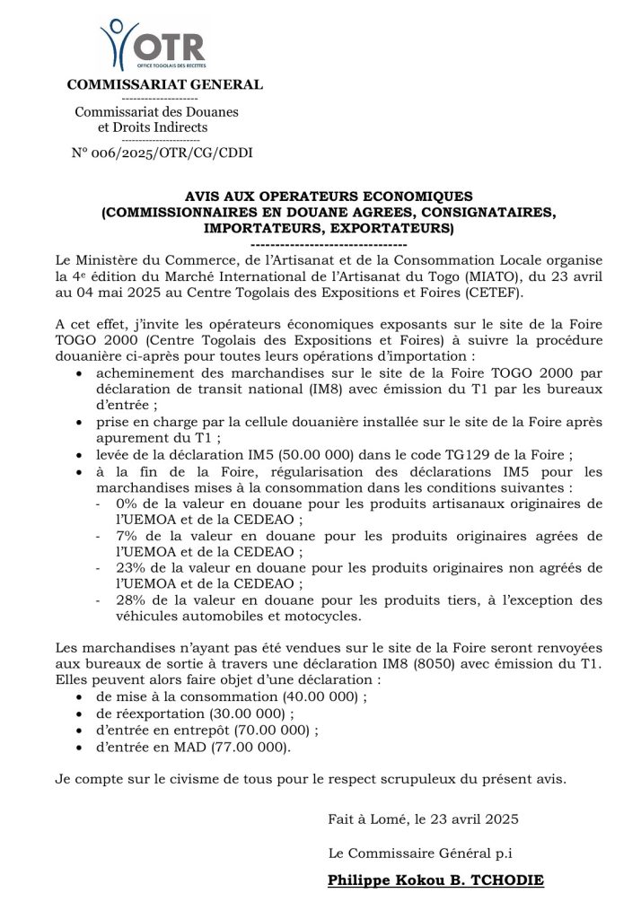 Rappelons que le CETEF abrite depuis le 23 avril dernier la 4ème édition du Marché international de l’artisanat du Togo (MIATO), un véritable carrefour culturel et économique qui célèbre le savoir-faire ancestral des acteurs du monde des artisans. Les expositions prennent fin le 04 mai prochain.