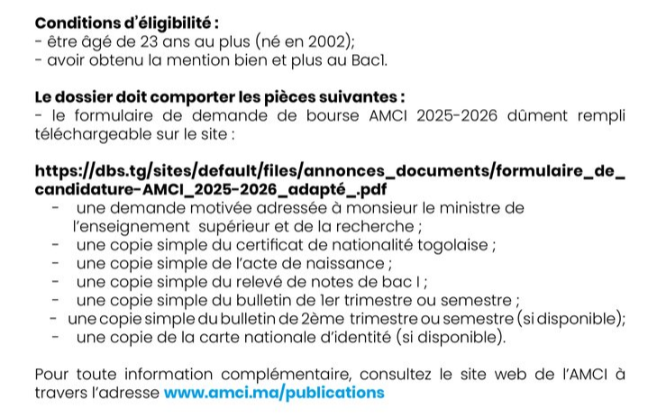Notons que les dossiers de candidature doivent être soumis au plus tard le vendredi 30 mai 2025 à 17h à la Direction des bourses et stages (DBS) à Lomé.