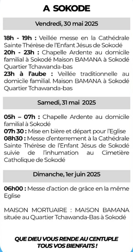 Rappelée à son Créateur le 13 avril 2025 à 97 ans, Maman BAROMA Kenkéhémba Philomène, épouse BAMANA, ancienne maîtresse couturière à Sokodé, préfecture de Tchaoudjo, sera inhumée au cimetière Catholique de Sokodé.