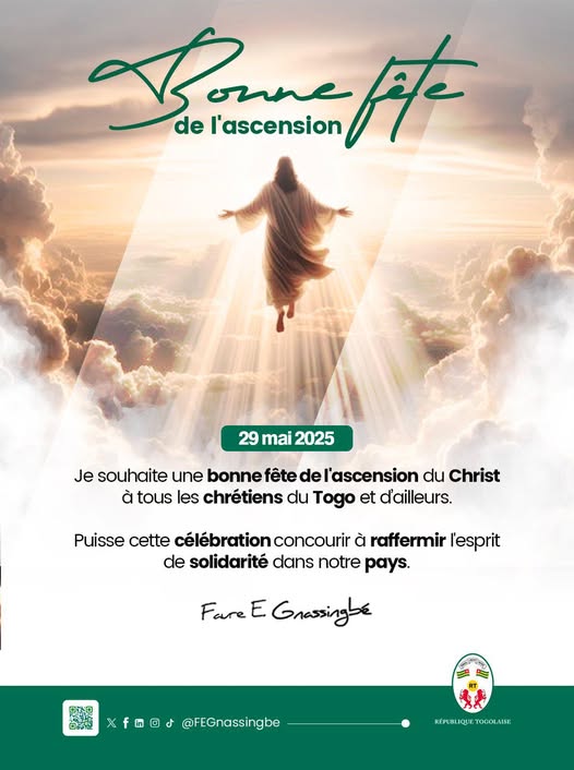 « Je souhaite une bonne fête de l’ascension du #Christ à tous les chrétiens du Togo et d’ailleurs. Puisse cette célébration concourir à raffermir l’esprit de solidarité dans notre pays », a-t-il écrit.