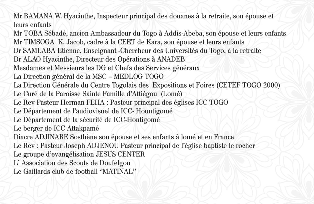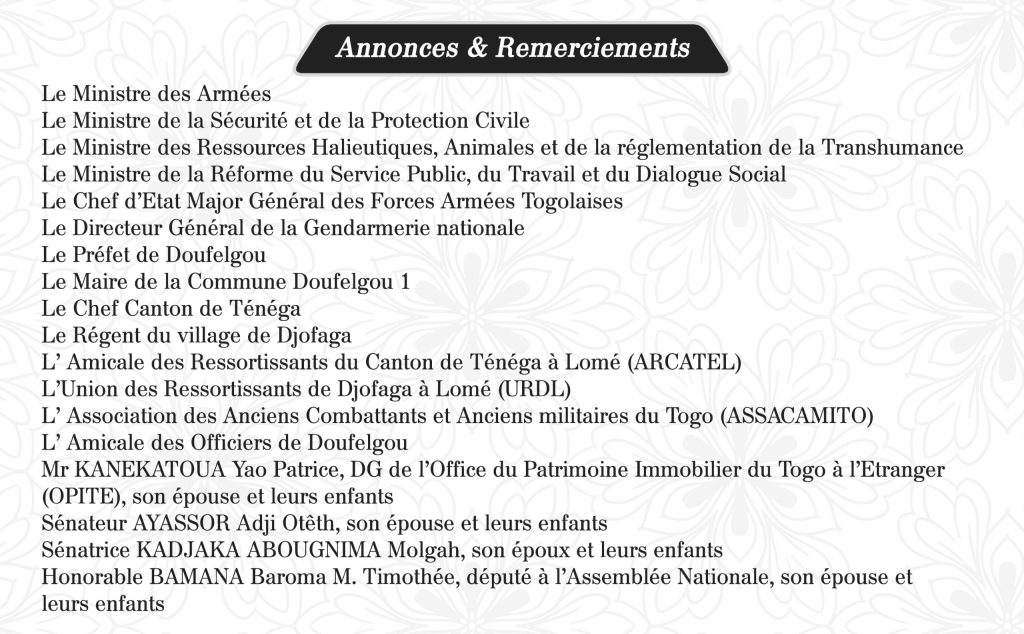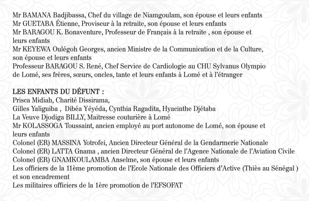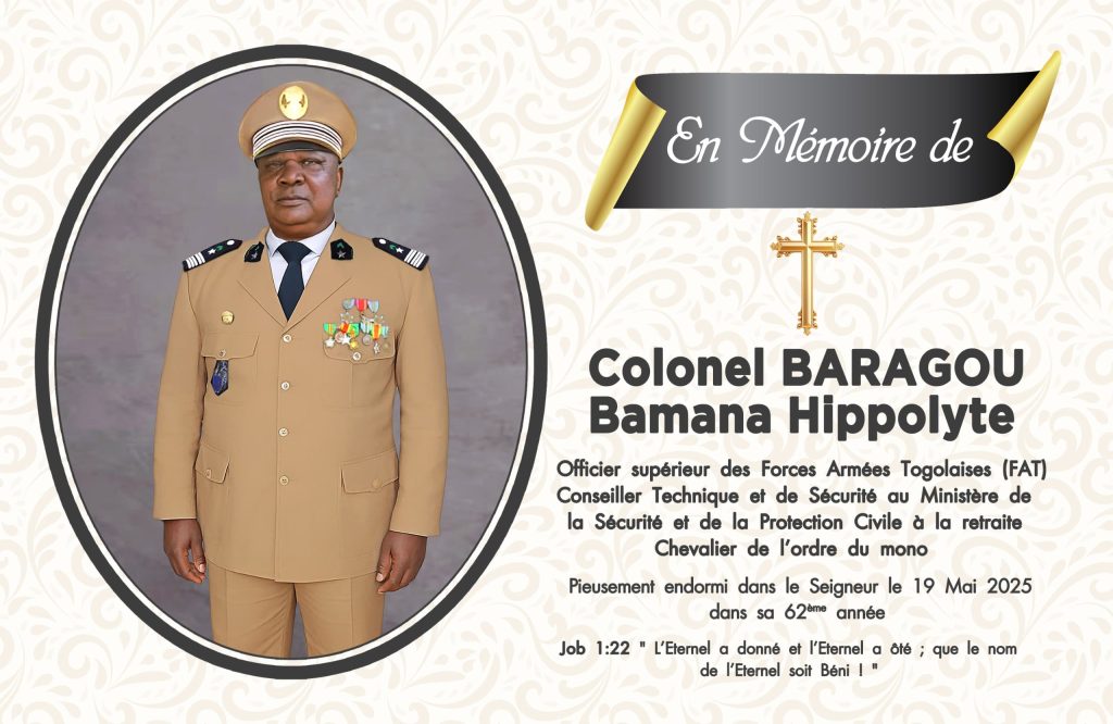 Officier supérieur des Forces Armées Togolaises (FAT), Conseiller Technique et de sécurité au Ministère de la Sécurité et de la Protection civile à la retraite, Chevalier de l’Ordre du Mono, le Colonel BARAGOU Bamana Hippolyte, pieusement endormi dans le Seigneur le 19 mai 2025, dans sa 62ème année, sera samedi 14 juin 2025 à Ténéga, préfecture de Doufelgou.