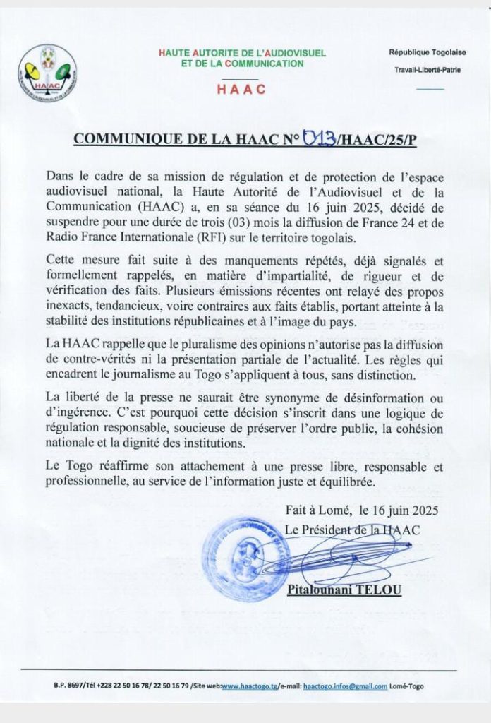 Réunis en séance plénière ce 16 juin, la HAAC a décidé la suspension pour trois mois, la diffusion de France 24 et RFI sur l’ensemble du territoire nationale.
