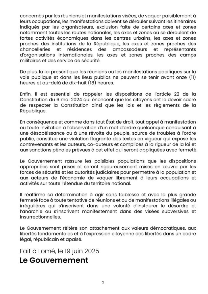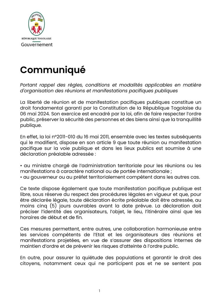 Dans un communiqué rendu public le 19 juin 2025, le gouvernement souligne que la liberté de réunion et de manifestations pacifiques publiques constitue un droit fondamental garanti par la Constitution du 06 mai 2024. Cependant, son exercice est encadré par la loi, dans l’optique de faire respecter l’ordre public, préserver la sécurité des personnes et des biens, ainsi que la tranquillité publique.