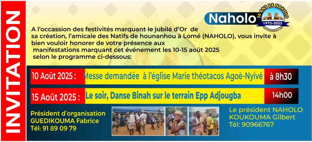 A l’occasion de cette célébration, déjà le dimanche 13 juillet dernier, il a été organisé une Journée de réflexion pour retracer le parcours de NAHOLO. Le dimanche10 août prochain, les filles et filles de Hounanhou à Lomé sont conviés à une messe d’action de grâce à l’église catholique Marie Théotokos d’Agoè-Nyivé. L’objectif : implorer la protection et la bénédiction dans la vie de l’amicale et de tous les Natifs, et implorer le repos éternel de l’âme des natifs disparus.