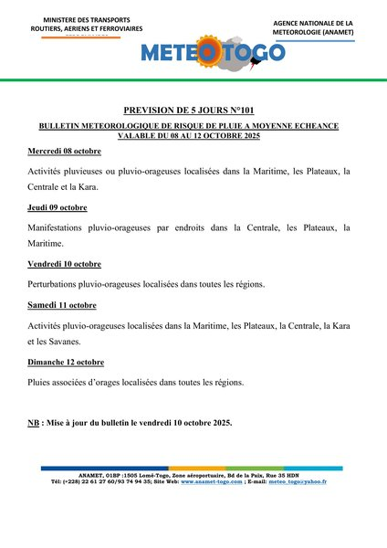 L’Agence nationale de la météorologie (ANAMET) a rendu public son bulletin de prévision pour les trois prochains jours. Selon ses prévisions, valables du 08 au 12 octobre prochain, il y aura activités pluvieuses ou pluvio-orageuses dans la Maritime, les Plateaux la Centrale et la Kara, ce mercredi 08 octobre.