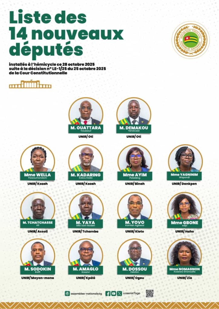 Hier mardi 28 octobre, la Représentation nationale a, en respect de la décision n° EL-1/25 du 25 octobre 2025 de la Cour constitutionnelle, intégré quatorze nouveaux députés. C’était lors de la deuxième séance plénière de la deuxième session ordinaire de l’année de l’institution.