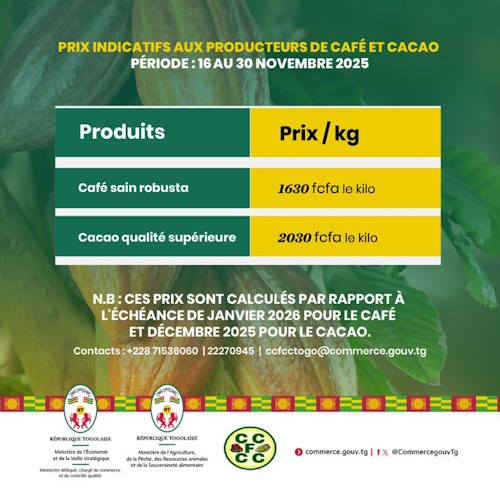 Le Comité de coordination de la filière caf et cacao (CCFCC), en collaboration avec le ministère du Commerce, a rendu public les nouveaux prix indicatifs aux producteurs de café et cacao pour la période du 16 au 30 novembre 2025.