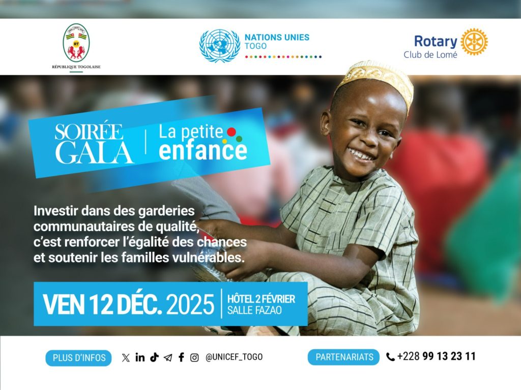 Le Togo se mobilise pour offrir un meilleur départ aux tout-petits. Ce 12 décembre 2025, la salle Fazao de l’Hôtel 2 Février accueillera une grande soirée de gala caritative organisée par le Gouvernement du Togo, en partenariat avec le Système des Nations Unies et le Rotary Club, en vue de soutenir la création des garderies communautaires intégrées dans les marchés du pays.