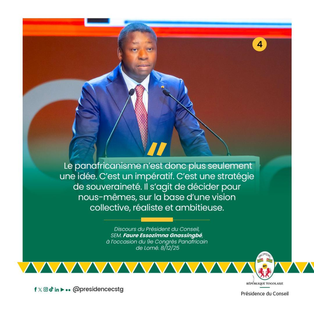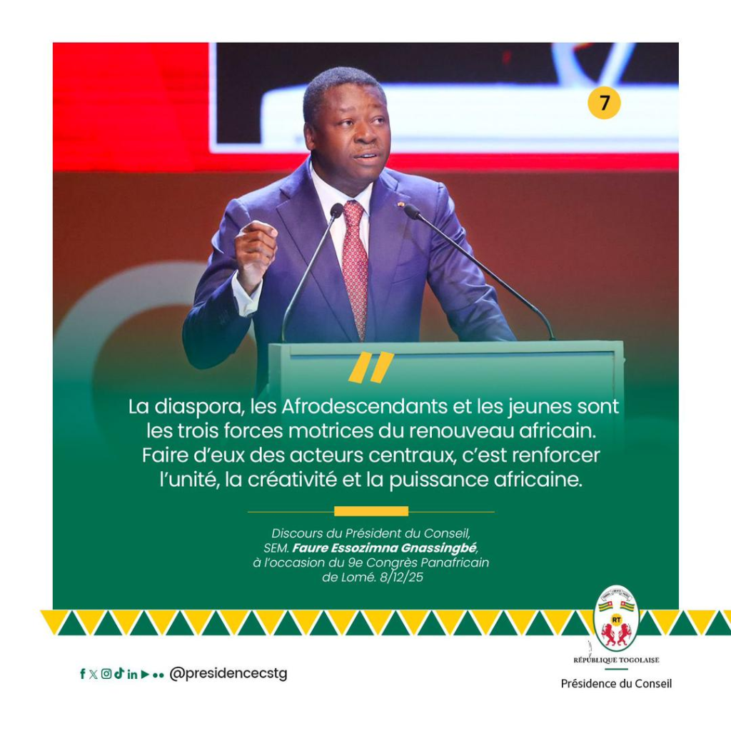 « Renouveau du panafricanisme et rôle de l’Afrique dans la réforme des institutions multilatérales : mobiliser les ressources et se réinventer pour agir », tel est le thème du 9è congrès panafricain que la capitale togolaise abrite depuis hier lundi. La cérémonie d’ouverture des travaux de cet important rendez-vous pour l’Afrique et sa diaspora, a été présidée par le Président du conseil, Faure Essozimna Gnassingbé.