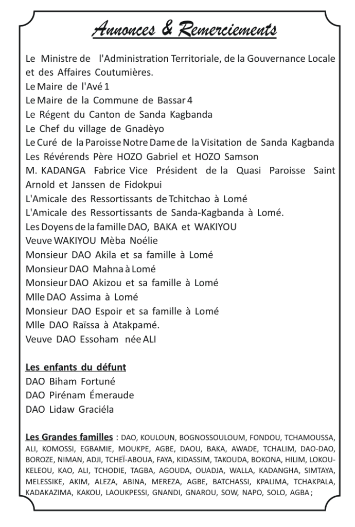 C’est donc avec une vive douleur que nous portons à votre connaissance le rappel à Dieu, le dimanche 21 décembre 2025, de DAO BISSANG IGNACE, Chef Service des Affaires Sociales et Culturelles à la Mairie d’Avé 1. Il n’avait que 44 ans !